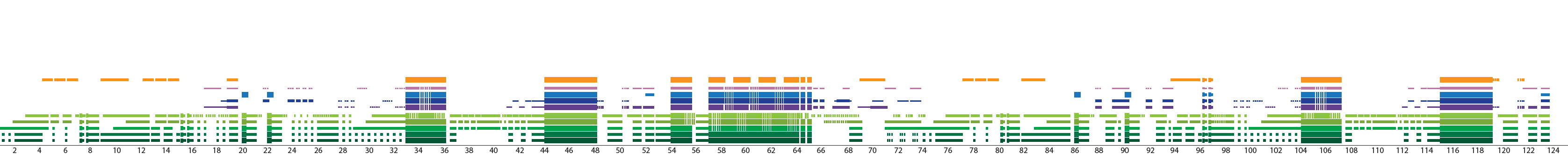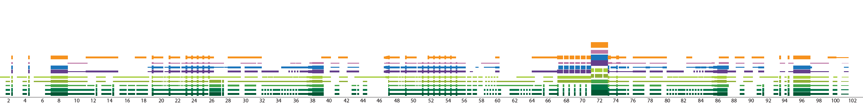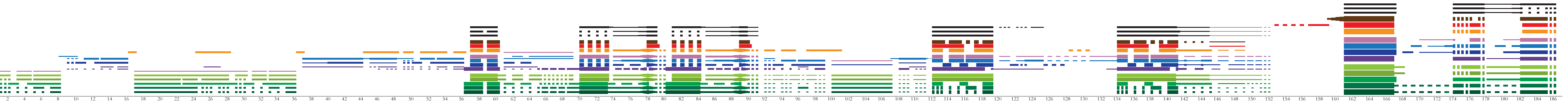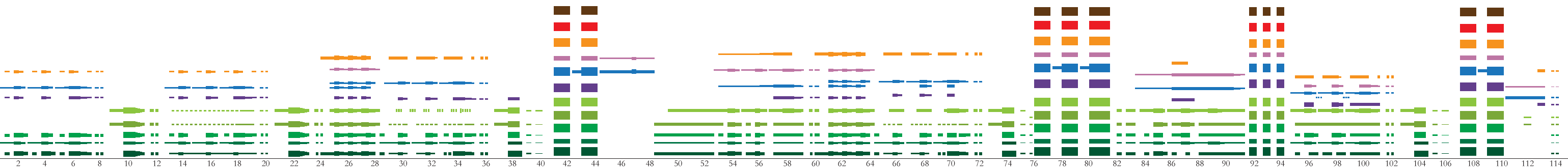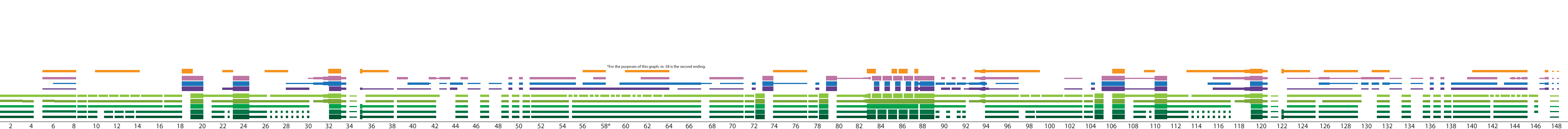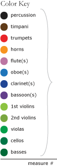 Colors are used to represent the instruments of the orchestra: strings are different shades of green, while the winds are a variety of colors. Line thickness reflects dynamics: the louder the volume, the thicker the line. The color scheme is a nod to one aspect of eighteenth-century associations of instruments and colors, namely the notion that strings were more uniform and while wind instruments were more variegated. The specific colors chosen loosely reflect some instrument-color associations (such as scarlet trumpets), but were determined first and foremost by design and legibility.